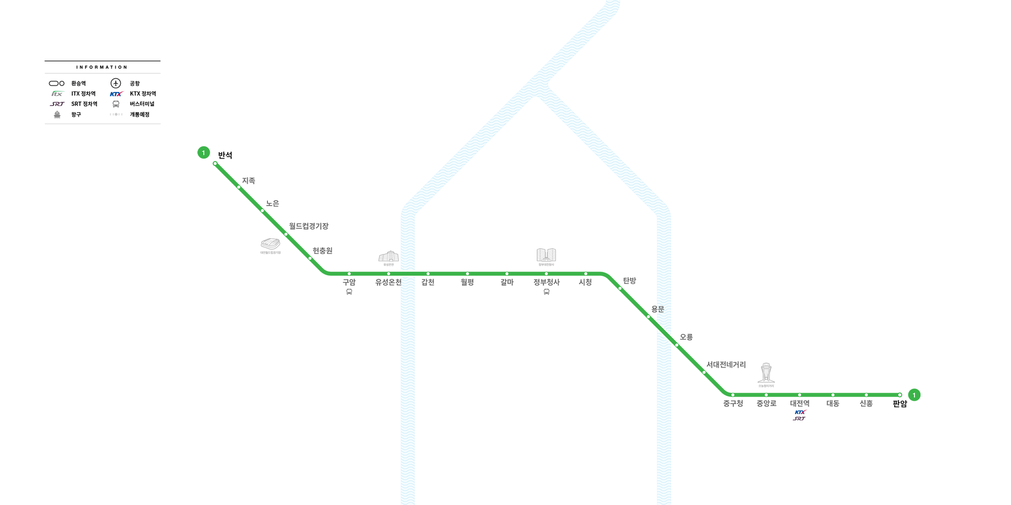 대전 지하철(대전 도시철도 1호선)은 판암역에서 반석역까지 도시의 중심을 관통하는 주요 노선으로 구성되어 있습니다.