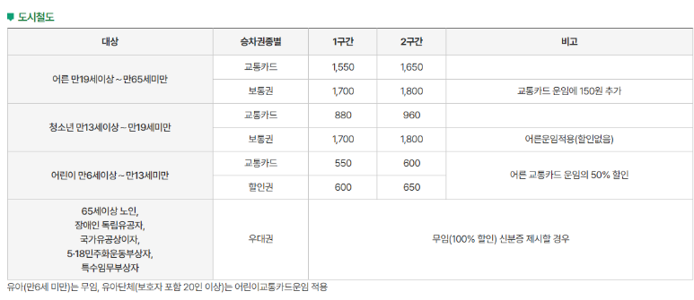 - 기본요금 (교통카드 기준): 일반 1,550원, 청소년 8,80원, 어린이 550원