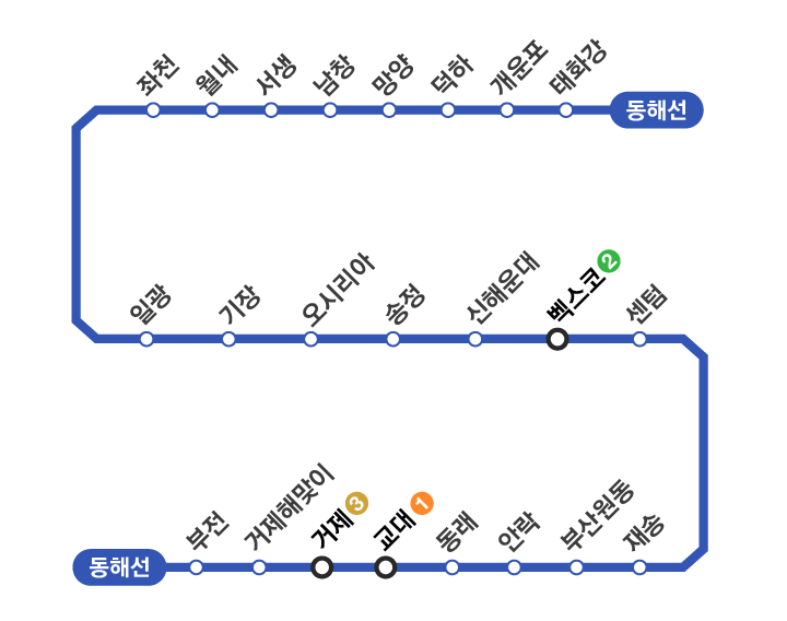 - 동해선은 일반 지하철과 달리 광역전철로 운행되어 정차역 간 간격이 다소 긴 편입니다. 미리 목적지 역을 정확히 확인해 두는 것이 편리합니다.