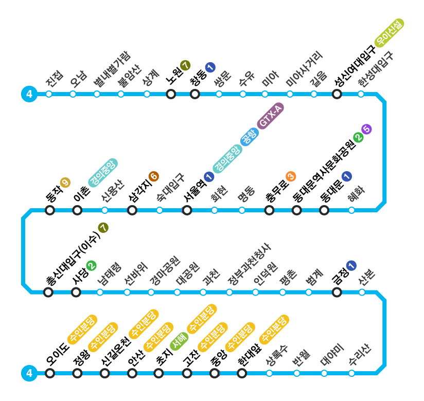 서울 지하철 4호선의 모든 역에는 무료 와이파이와 교통약자를 위한 엘리베이터, 에스컬레이터 시설이 완벽히 갖추어져 있어 편리한 이용이 가능합니다.