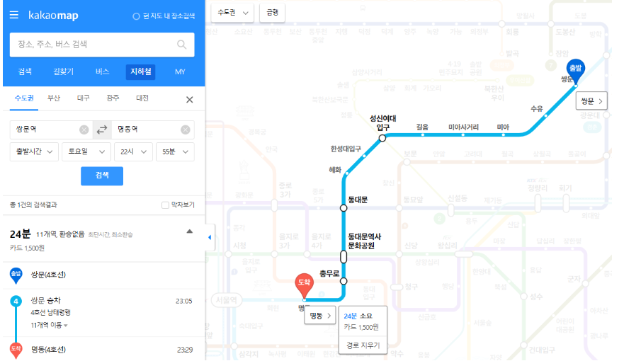 2️⃣ 지하철을 선택하고 출발역과 도착역을 입력합니다. 필요시 출발시간을 직접 설정할수도 있어 편리합니다.