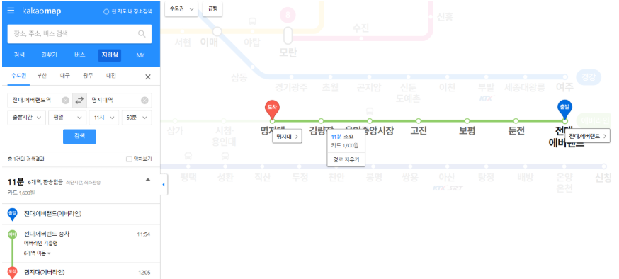 2️⃣ 에버라인을 선택하고 출발역과 도착역을 지정하면 바로 실시간 도착 예정 시간과 열차 위치가 나타납니다.