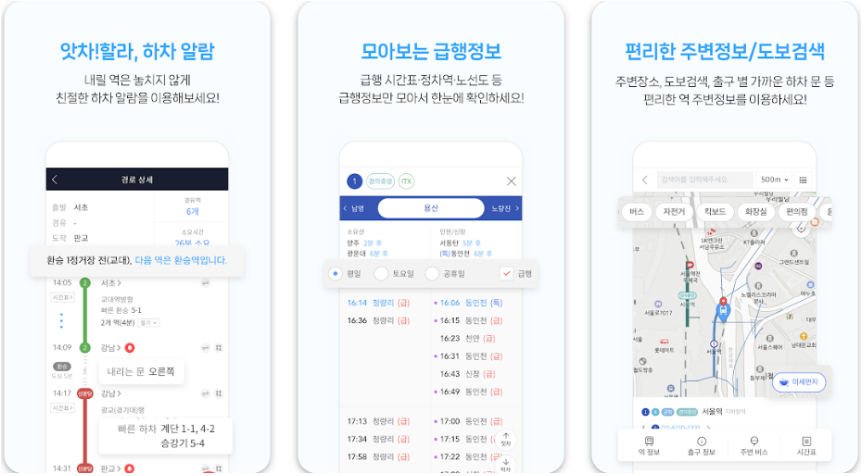 이외에도 환승역 정보와 빠른 출구 안내, 전국 버스 정보까지 제공되어 더욱 편리하게 이용 가능합니다.